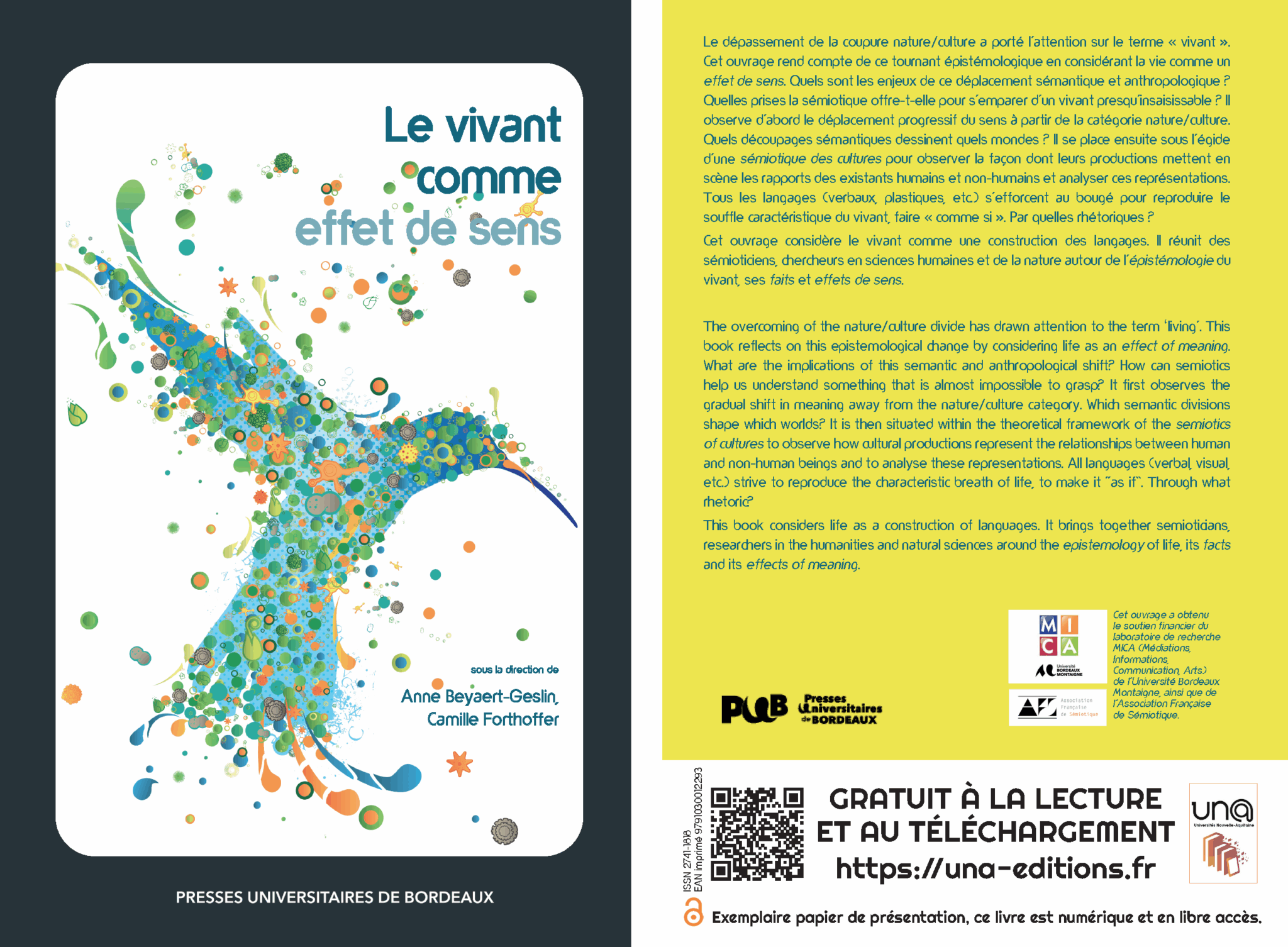 Beyaert-Geslin, Anne, Forthoffer, Camille, dir., Le vivant comme effet de sens, Pessac, Presses universitaires de Bordeaux, collection PrimaLun@ 36, 2025, [URL] https://una-editions.fr/le-vivant-comme-effet-de-sens