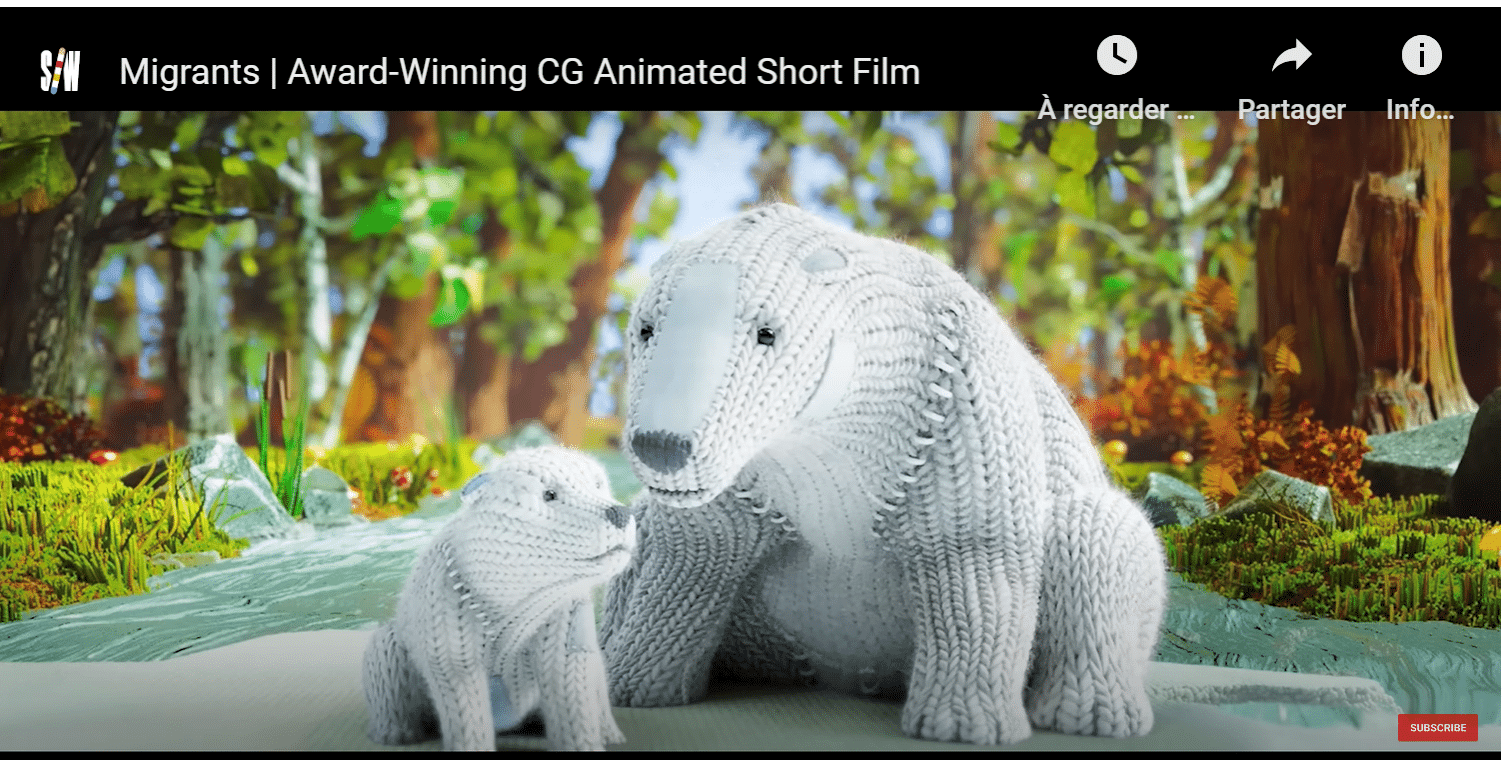 Le court-métrage Migrants porte sur le thème des réfugiés climatiques, en mettant en scène le voyage d’une famille d’ours polaires à partir d’un récit linéaire, basé sur un schéma narratif en trois actes. Le spectateur suit les obstacles des deux ours et le récit culmine avec la scène de la police des frontières, symbolisant le rejet et l’incompréhension des ours blancs par les ours noirs. Le film se caractérise par une esthétique de l’enfance avec des contrastes marqués entre le monde ordinaire et extraordinaire par les couleurs et les textures. Le choix de matière de l’ours en tricot renforce l’idée de naïveté et d’incompréhension.